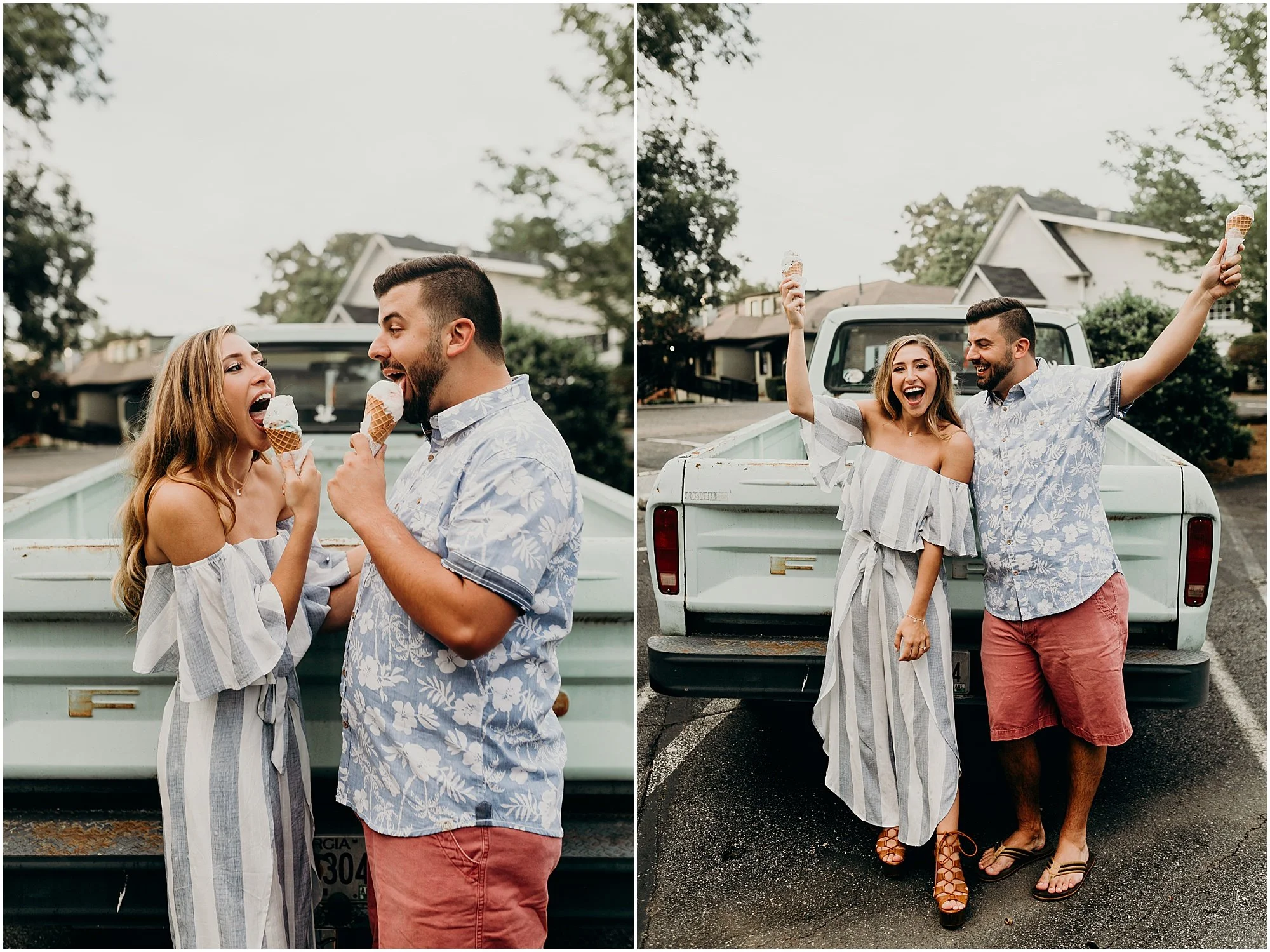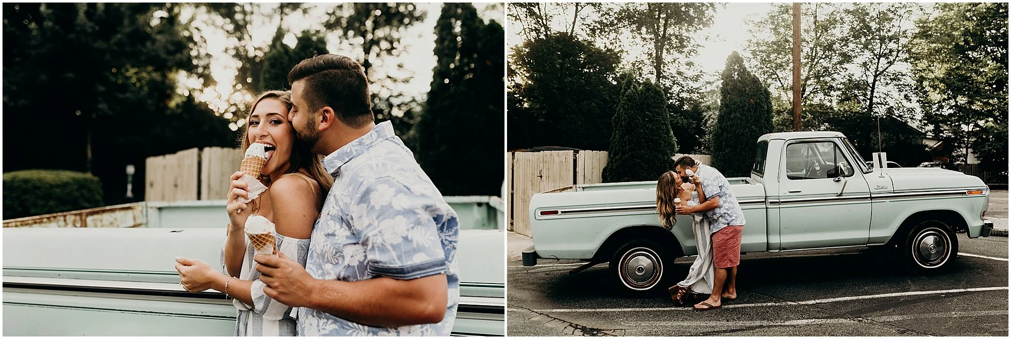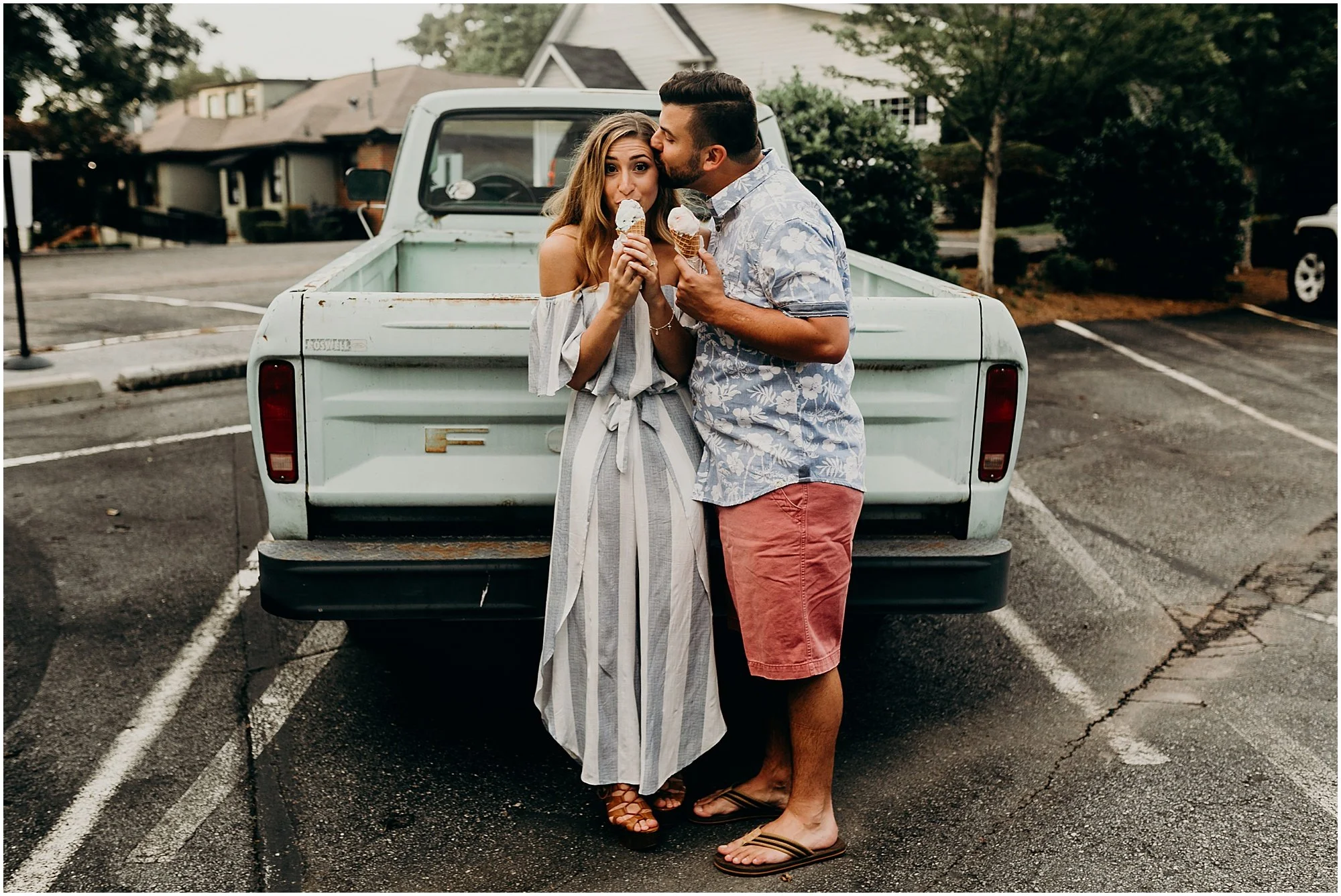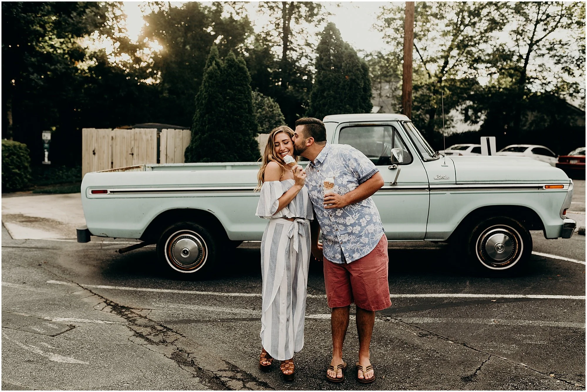 This engagement session is in the books as one of my favorites. It was shot in 2017, but I wanted to repost it, because it’s simply adorable, and both Alex & Curtis were pretty confident during their shoot, they were easy to direct in posing, and they were so much fun to capture! Alex had done her research and she pretty much knew what she wanted. She chose Downtown Roswell because that was a place that they usually hung out and went out for dates at. We did hit Old Roswell Mill first, which was nice, they had their formal outfits on first and we got some great shots there, but there were so many people there that we quickly moved on to Downtown Roswell. Alex knew about this ice cream shop [ which I think is closed now 🙁 ] but we got ice cream and went outside, where I spotted that mint green truck with the sun setting behind it (perfect timing – I thought) and immediately went for it! Eventually we ended up on one of the home/shops porch for our final photos across the street. Their photo with the ice cream in Downtown Roswell was one of the highest reposted photos i’ve ever taken. It got published on Shootproof, TwoBrighLights, and many other wedding publications. Even a year later I would be receiving emails from random publications that ran across their photo with the ice cream in front of the green truck wanting to repost and use it on their site. The point I’d like to make is that the reason why their engagement session was so amazing, fun and in the end reposted by many wedding publications was because they took the time before their engagement session to plan something fun! They planned and coordinated their outfit, they researched fun ideas on Pinterest, they ran their ideas by me (their photographer) and most importantly they allowed themselves to be loving and goofy in front of the camera for the world to see!