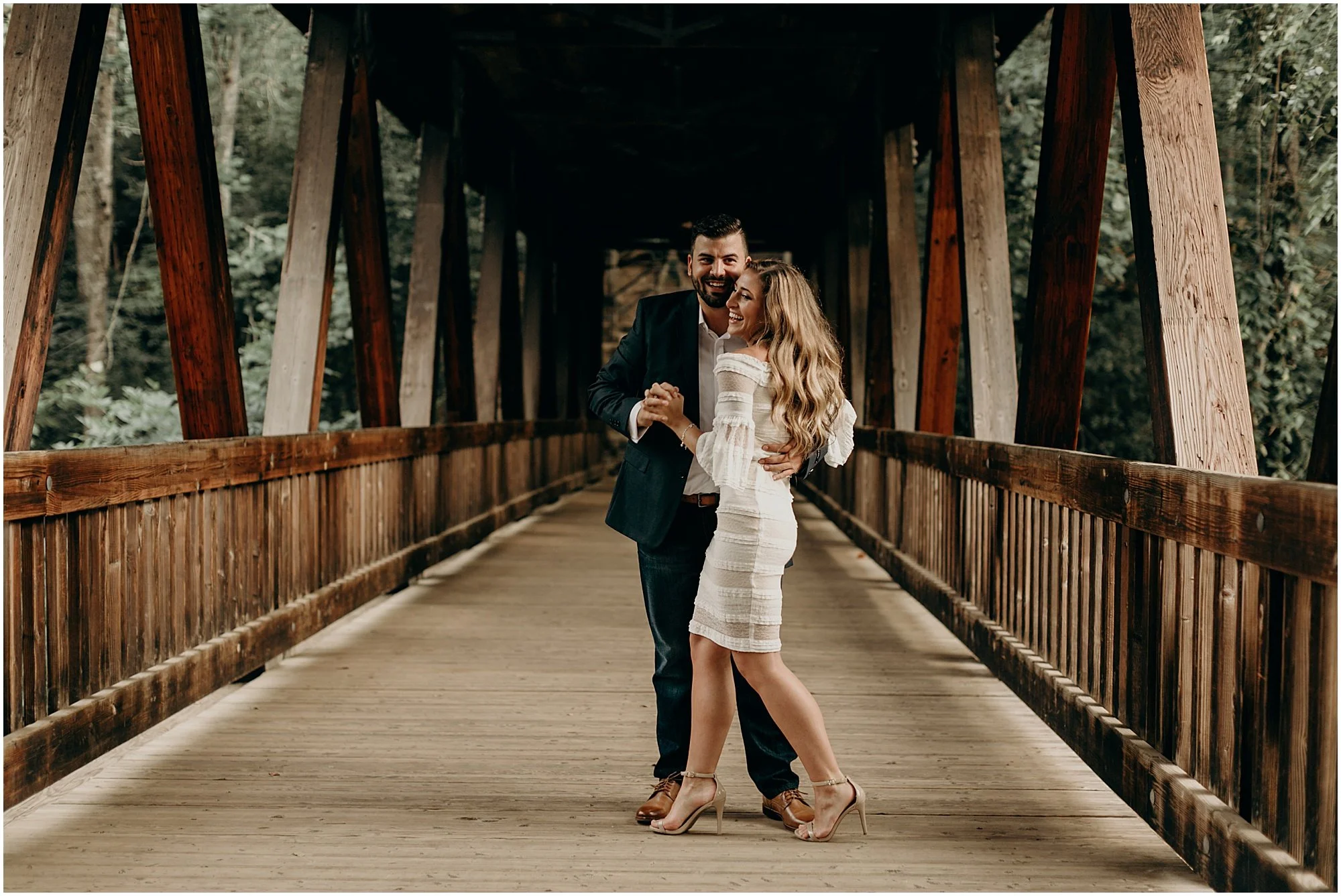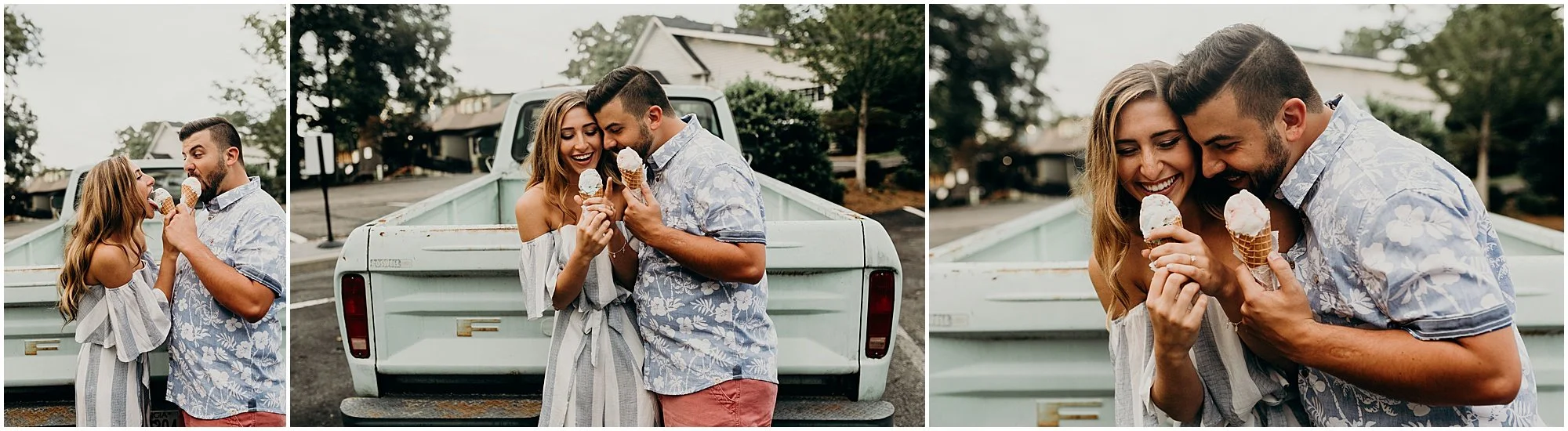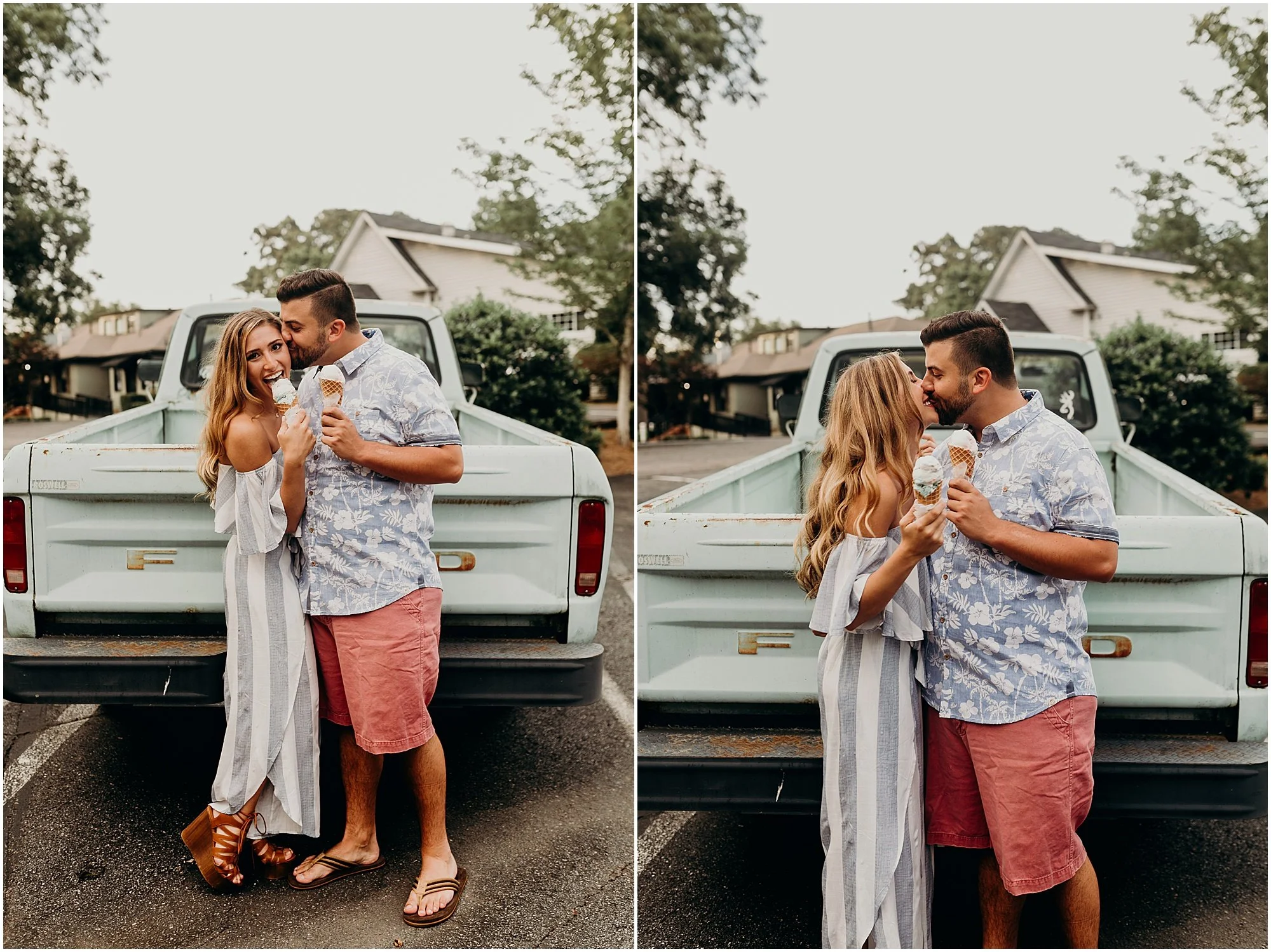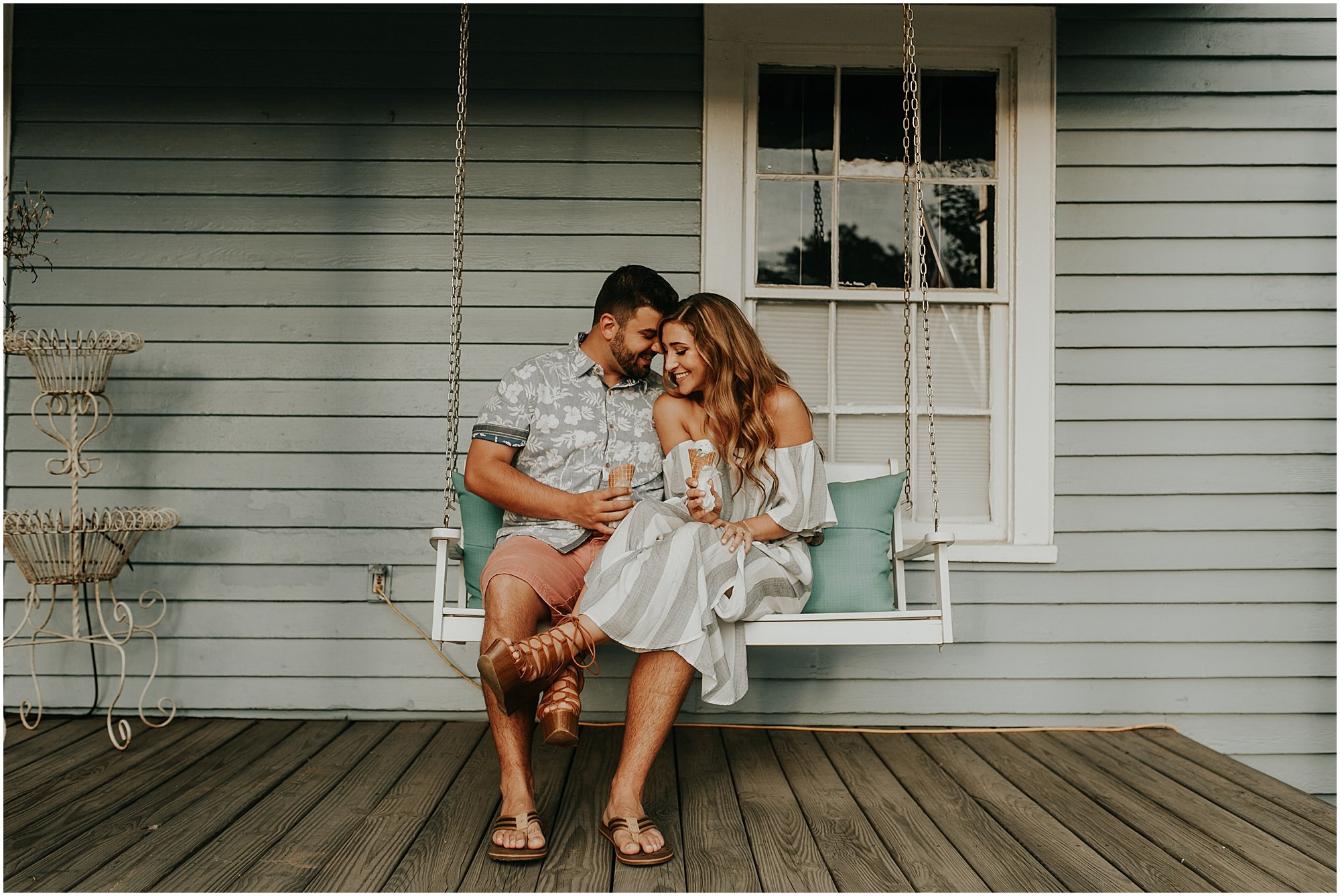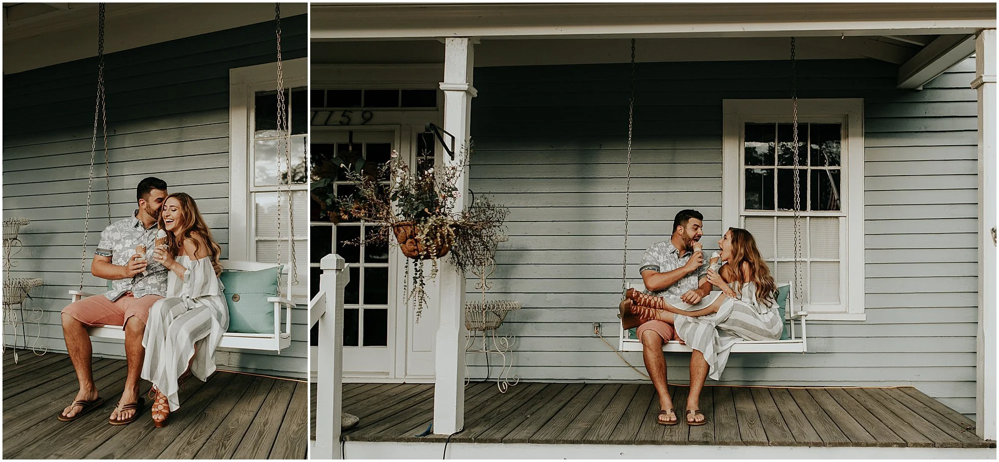 This engagement session is in the books as one of my favorites. It was shot in 2017, but I wanted to repost it, because it’s simply adorable, and both Alex & Curtis were pretty confident during their shoot, they were easy to direct in posing, and they were so much fun to capture! Alex had done her research and she pretty much knew what she wanted. She chose Downtown Roswell because that was a place that they usually hung out and went out for dates at. We did hit Old Roswell Mill first, which was nice, they had their formal outfits on first and we got some great shots there, but there were so many people there that we quickly moved on to Downtown Roswell. Alex knew about this ice cream shop [ which I think is closed now 🙁 ] but we got ice cream and went outside, where I spotted that mint green truck with the sun setting behind it (perfect timing – I thought) and immediately went for it! Eventually we ended up on one of the home/shops porch for our final photos across the street. Their photo with the ice cream in Downtown Roswell was one of the highest reposted photos i’ve ever taken. It got published on Shootproof, TwoBrighLights, and many other wedding publications. Even a year later I would be receiving emails from random publications that ran across their photo with the ice cream in front of the green truck wanting to repost and use it on their site. The point I’d like to make is that the reason why their engagement session was so amazing, fun and in the end reposted by many wedding publications was because they took the time before their engagement session to plan something fun! They planned and coordinated their outfit, they researched fun ideas on Pinterest, they ran their ideas by me (their photographer) and most importantly they allowed themselves to be loving and goofy in front of the camera for the world to see!
