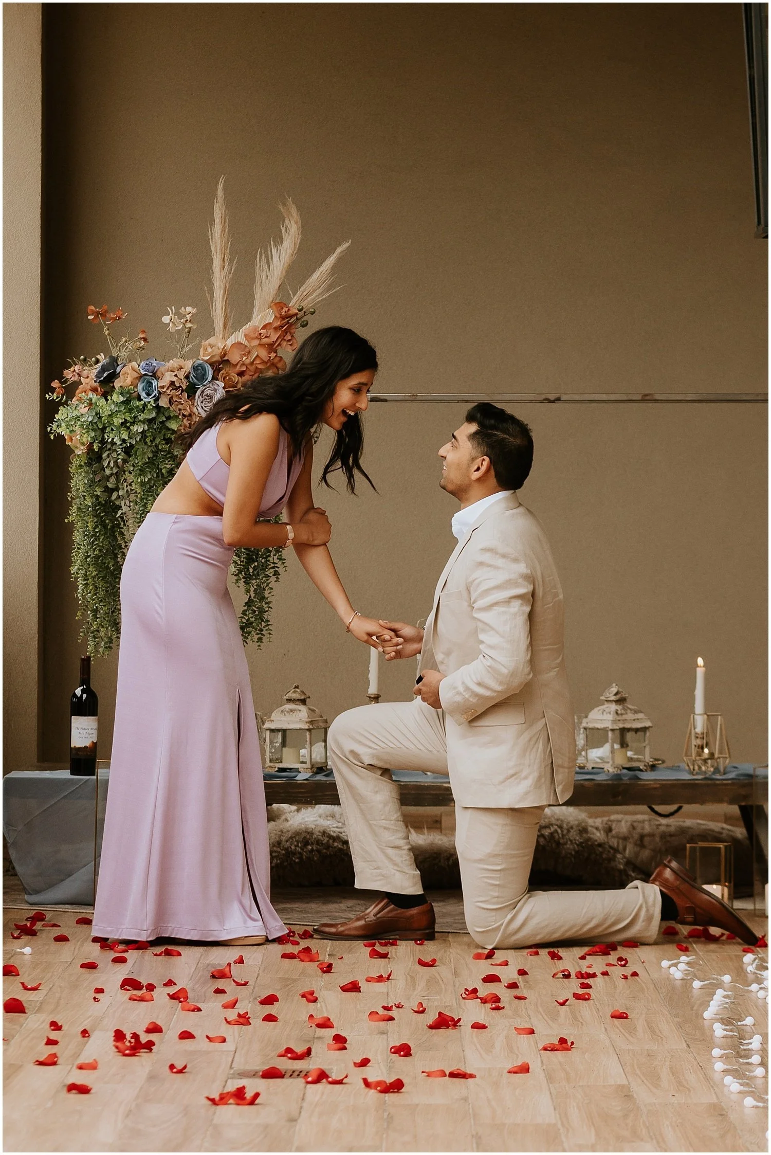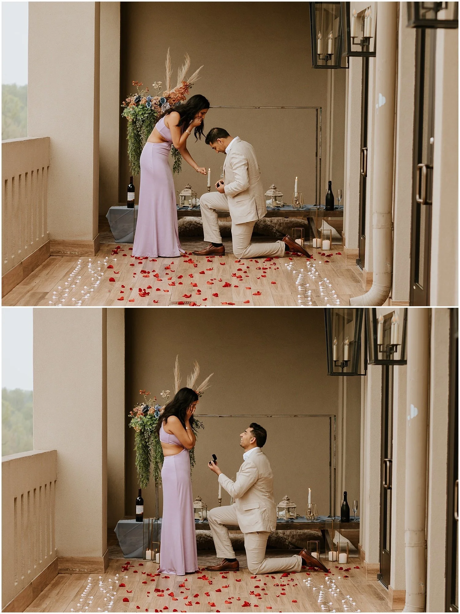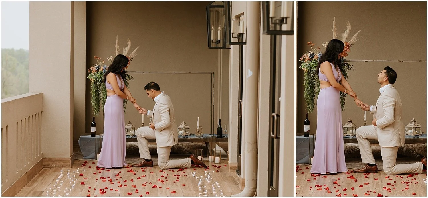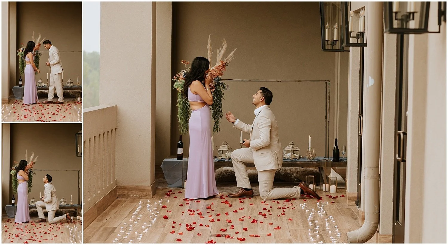 Jai had been dating Raina for 4.5years and now was the time to proposal!! He planned a whole scavenger hunt activity for the whole day on her birthday that would take her all around Atlanta. the hunt would end at Chateau Elan Winery where he told her they were going to have dinner together. Little did she know that he had hired a venue coordinator, a photographer, and a videographer to capture this special moment. He also had a picnic style table decor set up on a private balcony at Chateau Elan Winery overlooking the winery. He had rose petals on the floor that would lead them to the picnic table where Jai got down on one knee and poured out his heart to Raina and asked her to marry him. Of course, she SAID YES!!! Who wouldn’t!!