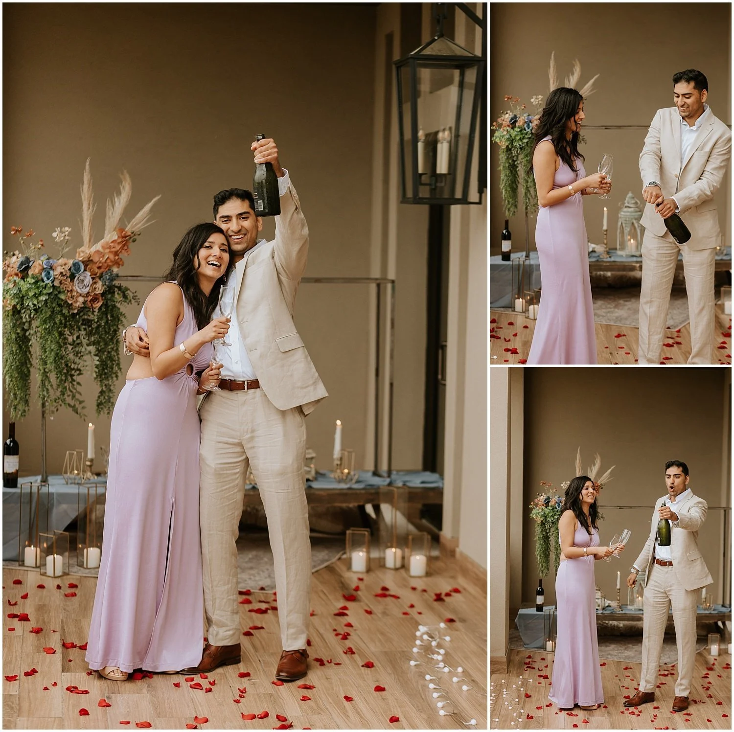 They popped champagne together and took photos around the venue at Chateau Elan. We used the sunset Golden hour to capture the prettiest moments with the soft sunlight in the back, they both looked stunning as they strolled together through the vines of the winery. It was an unforgettable moment for our photo/video team and i’m sure for the two of them!! We are so glad to have captured this special moment for both Jai and Raina. Congrats guys – now have fun planning the best wedding ever!!!!