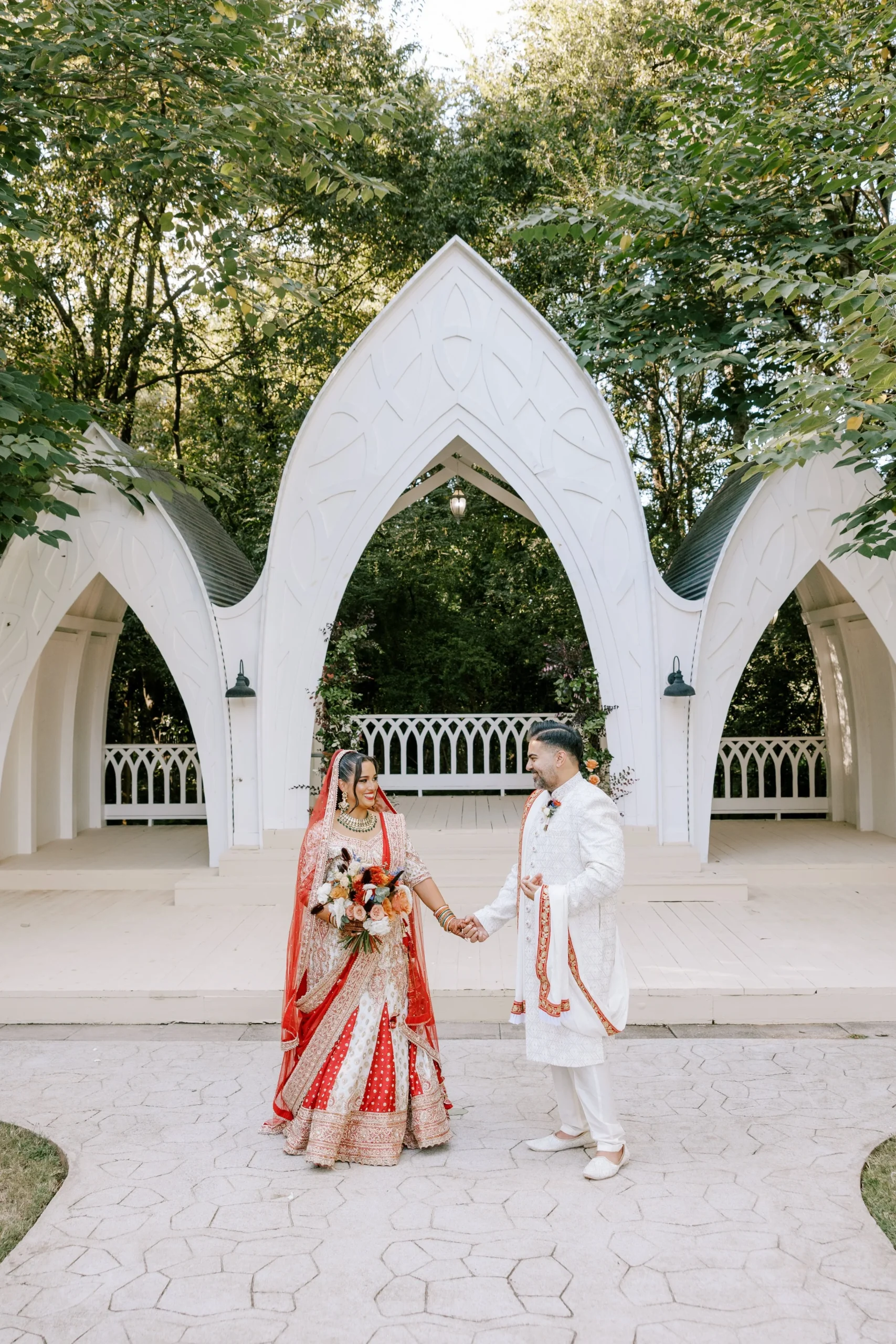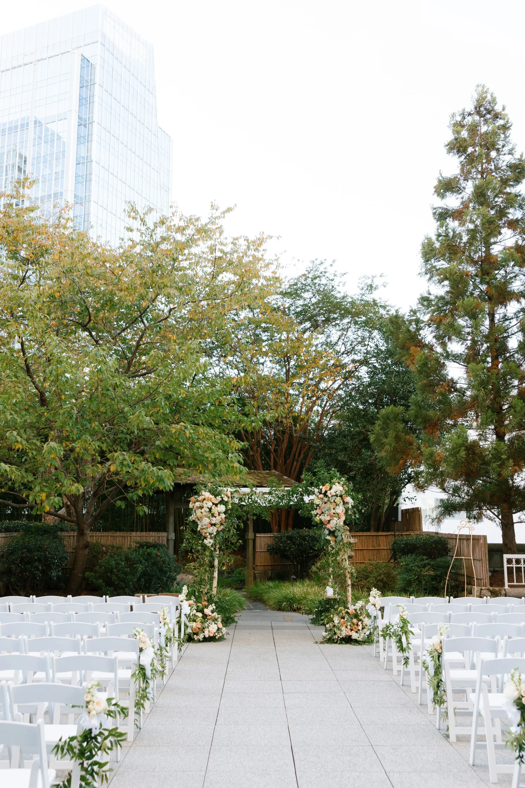 A cathedral-style backdrop anchors the garden at The Wildflower 301, with seating on either side of a paved aisle. Lit paths lead into the ceremony garden area in 2 different directions. Twinkle lights, candelabras and lush gardens are all special touches to this special venue that has won our hearts.