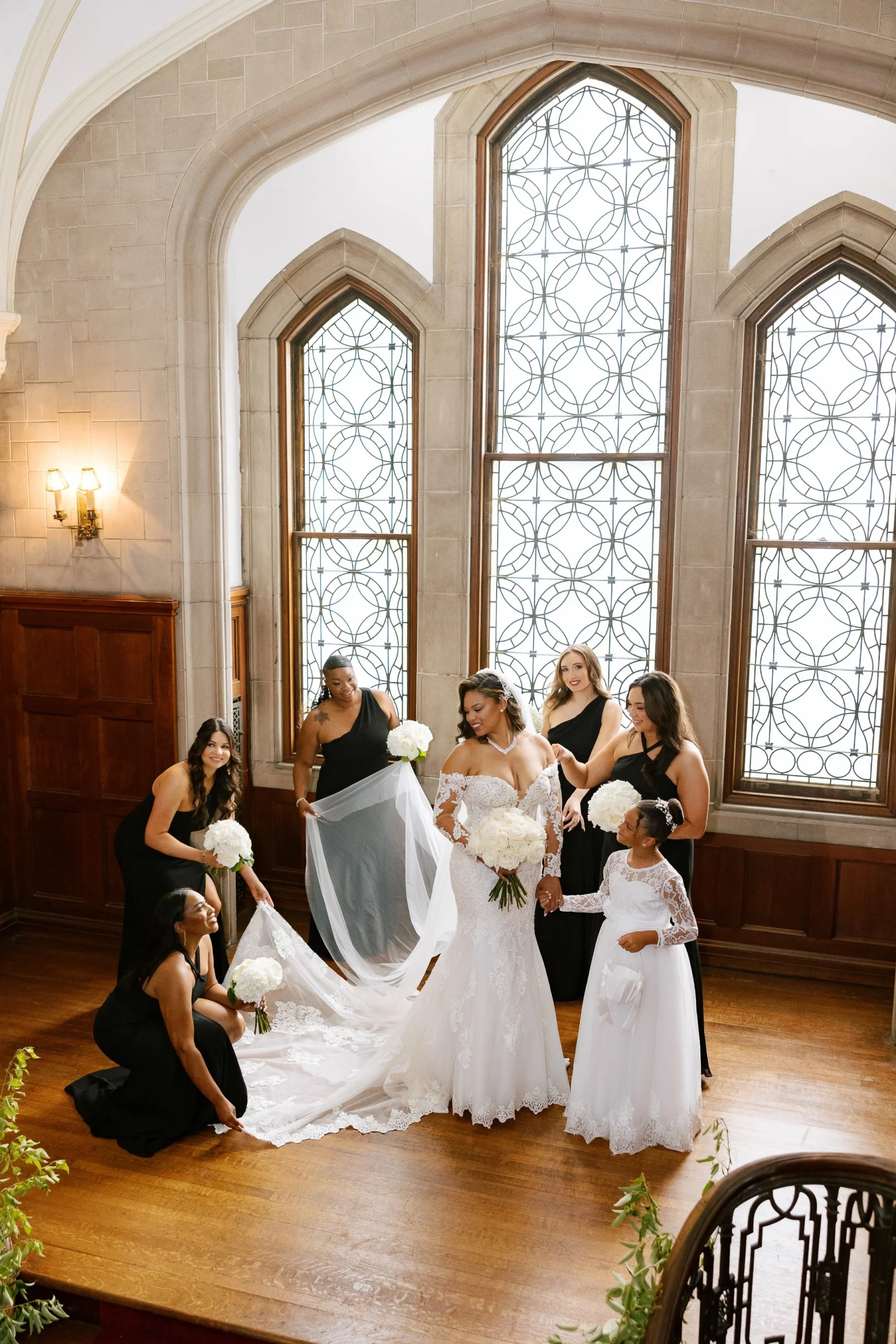 The black, white, and gold colors combined effortlessly to create an atmosphere of sophistication with a modern twist. Imagine the outdoor ceremony in a garden adorned with ivory blooms, gold accents, and sleek black chairs, which was picture-perfect against the historic backdrop.