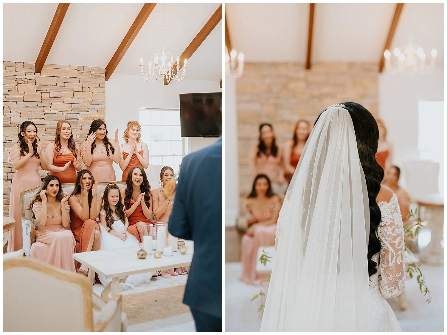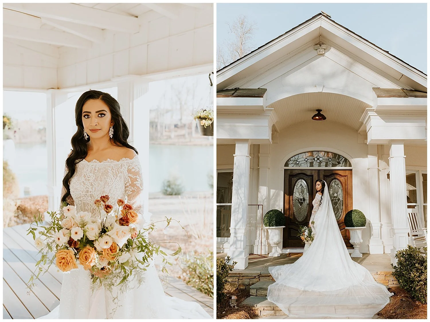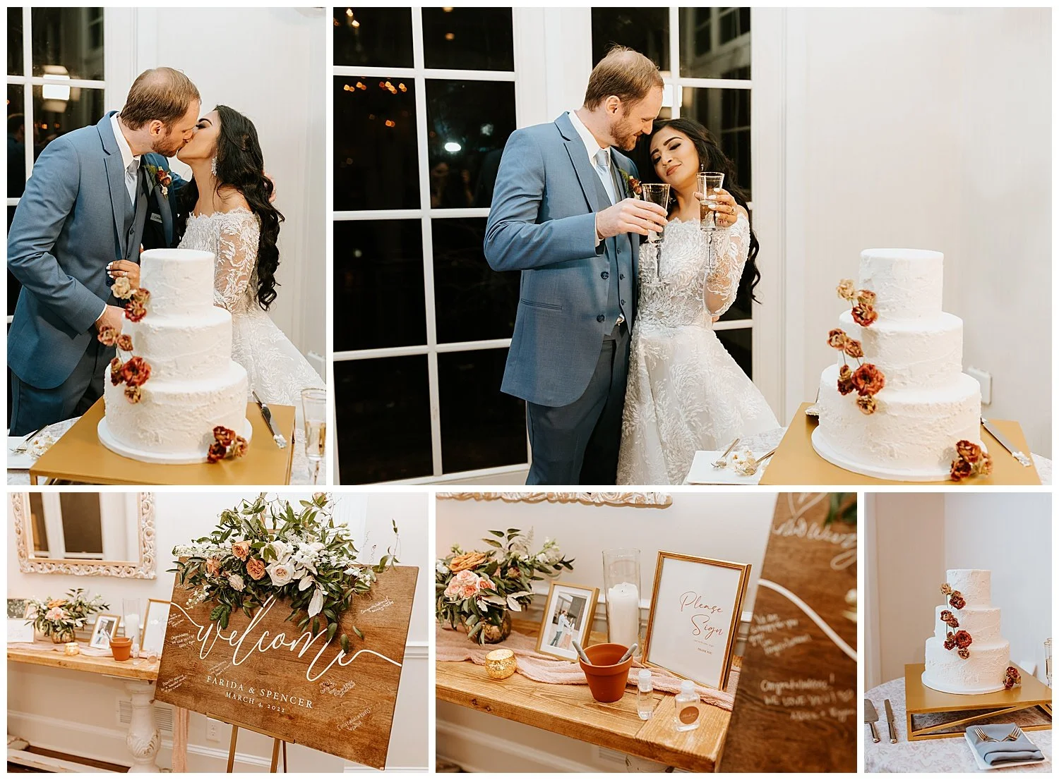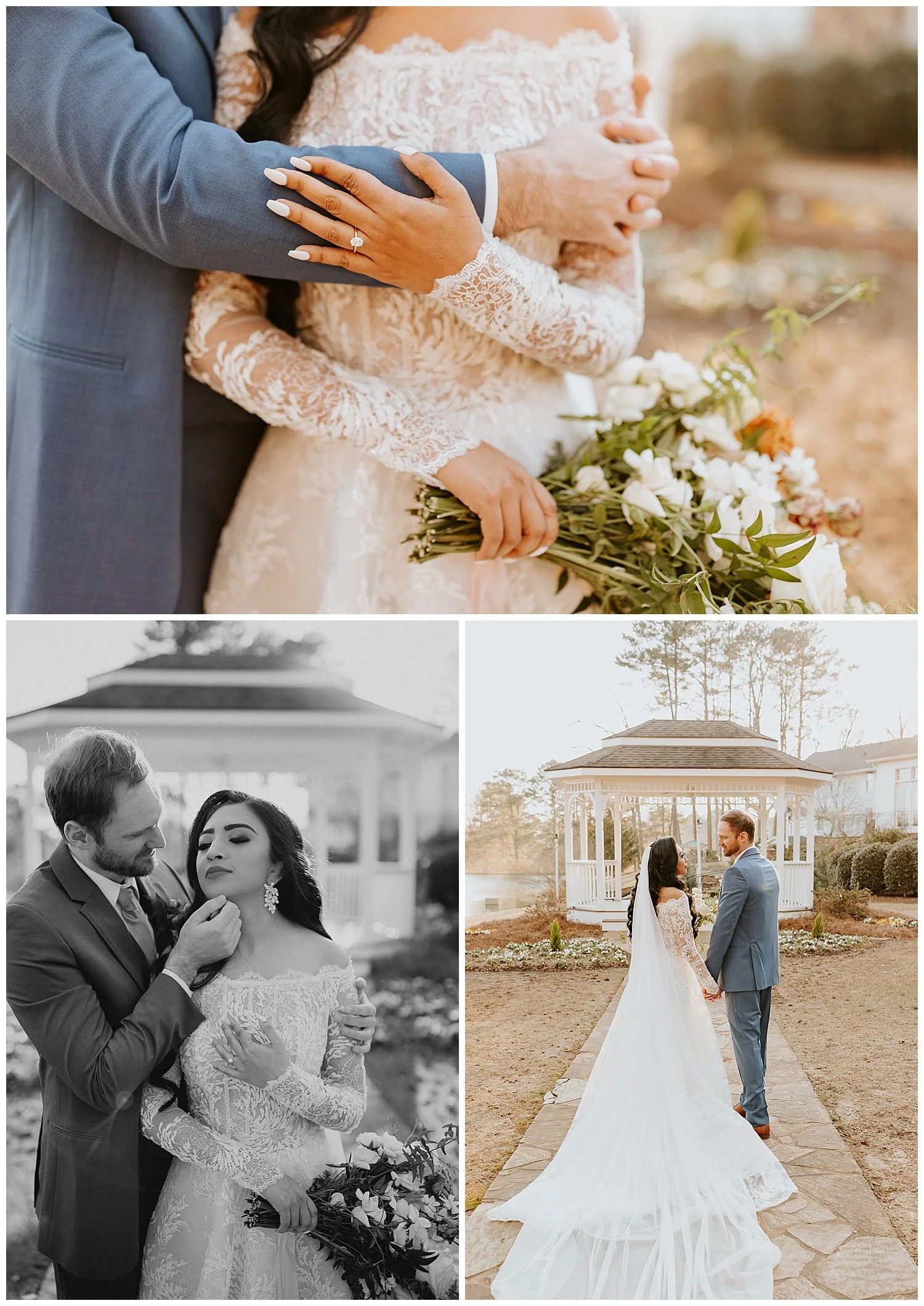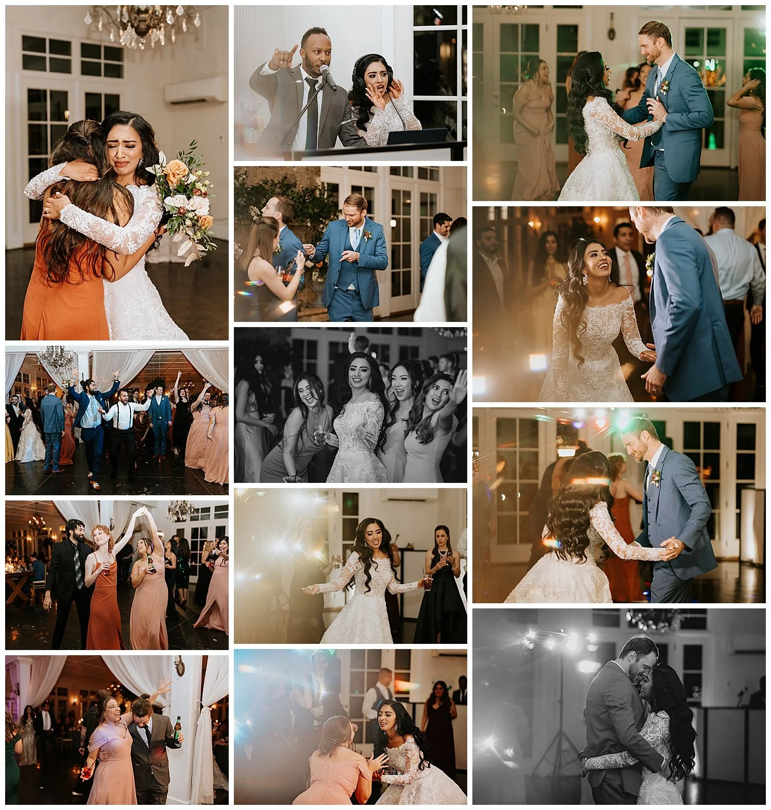 This wedding was recently featured on CARATS AND CAKE wedding blog and we are so proud that our work has once again gained the recognition by a high end wedding publication and been featured on their website. Sp proud to be posting this wedding on our blog as well. We had the pleasure as Atlanta wedding luxury photographers to capture this wedding that took place at Little River Farms in Milton, Georgia. Farida was a wonderful bride to work with because she really cared about the decor and the details and had the vision of what she wanted captured so it made it so much easier to get these final beautiful images from this wedding. Little River Farms is one of my favorite venues to photograph weddings, its spacious, its got so many option for portraits, offers several places for the ceremony and has a backup plan in case of inclement weather. Farida and Spencer decided to have their ceremony indoors since they got married in early March and the weather would be kinda chilly around that time of year in Georgia. Little River Farms offers this beautiful fireplace room as the backdrop for her ceremony, with pristine white ceilings and walls, and these beautiful chandeliers to adorn her photos. Stylish Stems Atlanta did a marvelous job at decorating the fireplace and the reception room to make the bride’s vision come alive. Paper Daisies Stationery created the gorgeous invitation suite that complimented the details with the soft blue, pink and grey invite set. Let’s talk about the bride’s dress which was designed by the talented Dany Tabet and purchased from White Magnolia Bridal in Atlanta. The wedding dress carried the classic theme with beautiful off the shoulder long sleeves and floral details that just complimented the bride so well. The bridesmaids wore Birdy Grey dresses in mismatched colors and styles in peachy-orange shades. This wedding was a blast and the wedding party sure had so much fun getting down on the dance floor. As luxury wedding photographers, we are always keeping an eye out on all corners of the room and we get right in the middle of everyone to capture the best photos of the guests dancing and letting loose. We make sure to capture those emotional and happy moments throughout the day. This is also why it’s important to have a second shooter, so that we can make sure to keep our eyes out for your guests as well as your family and bridal party.