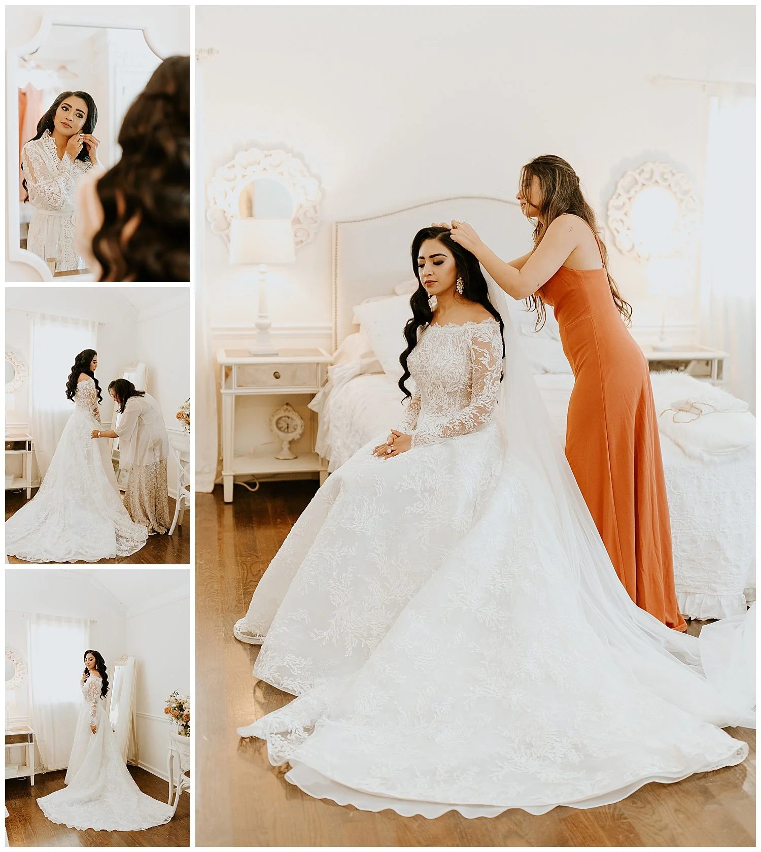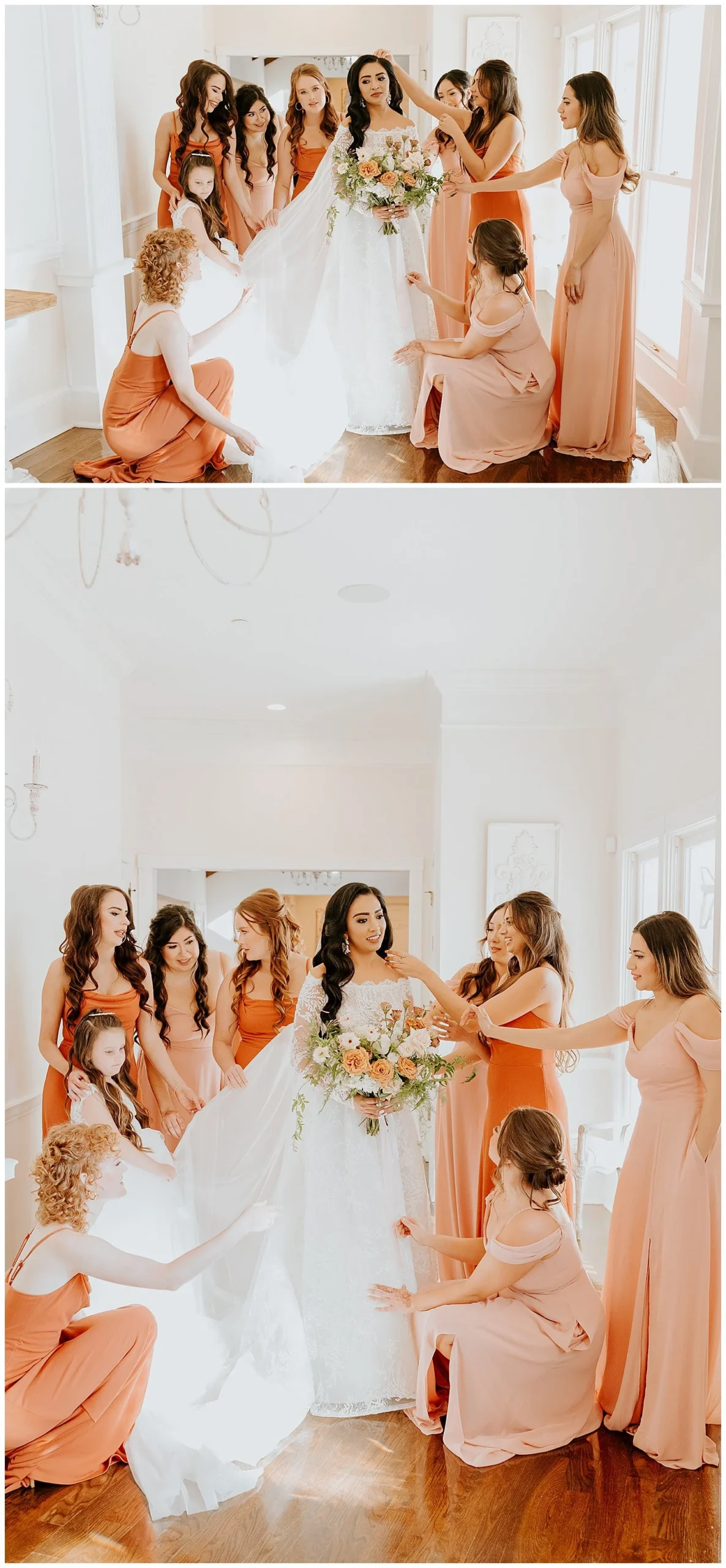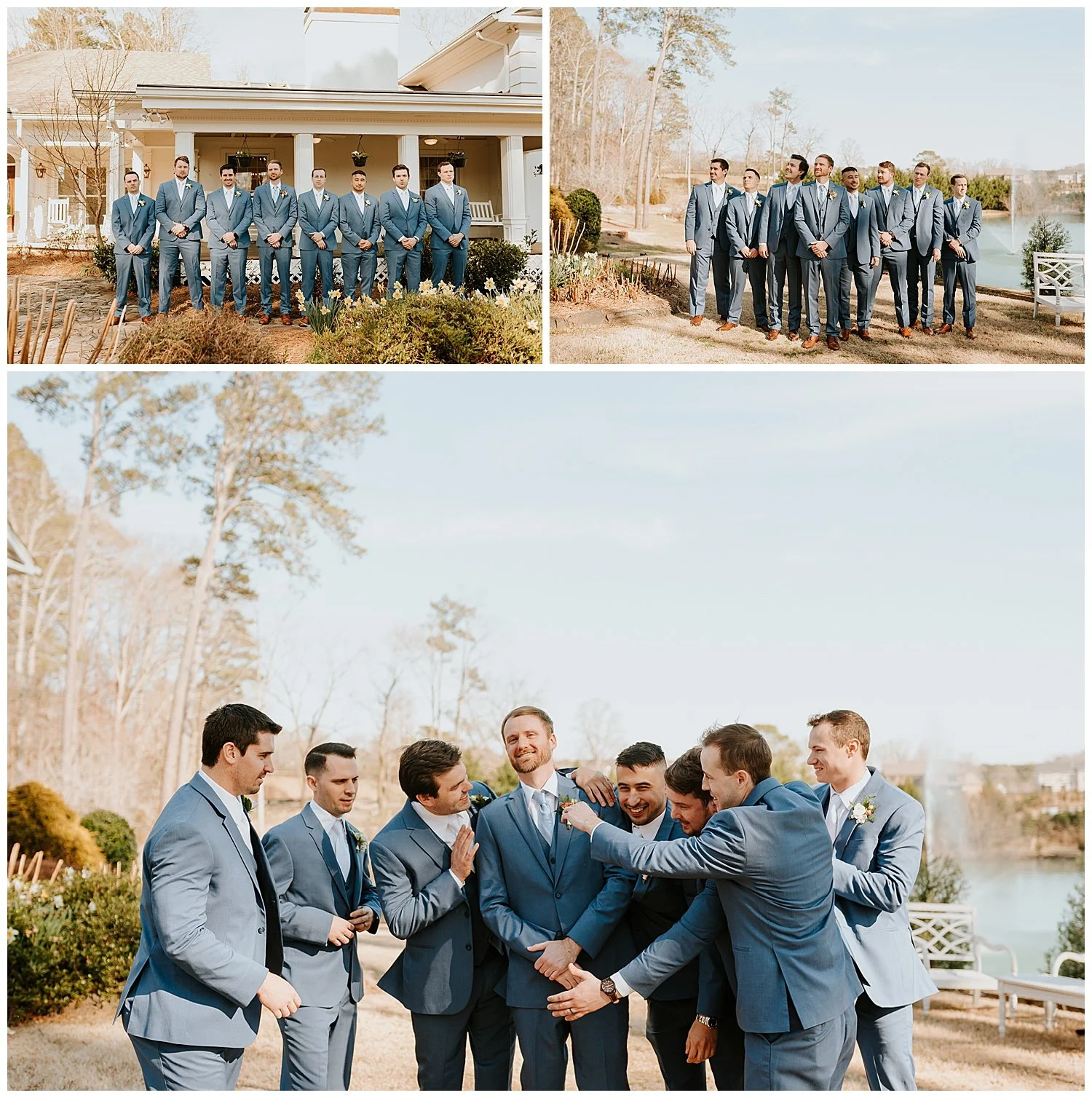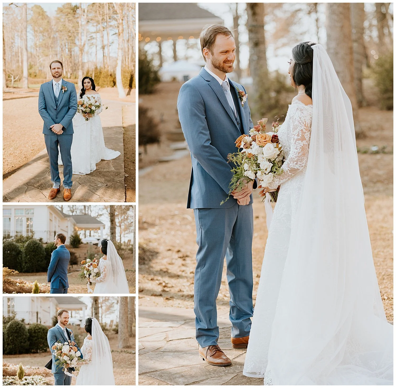 This wedding was recently featured on CARATS AND CAKE wedding blog and we are so proud that our work has once again gained the recognition by a high end wedding publication and been featured on their website. Sp proud to be posting this wedding on our blog as well. We had the pleasure as Atlanta wedding luxury photographers to capture this wedding that took place at Little River Farms in Milton, Georgia. Farida was a wonderful bride to work with because she really cared about the decor and the details and had the vision of what she wanted captured so it made it so much easier to get these final beautiful images from this wedding. Little River Farms is one of my favorite venues to photograph weddings, its spacious, its got so many option for portraits, offers several places for the ceremony and has a backup plan in case of inclement weather. Farida and Spencer decided to have their ceremony indoors since they got married in early March and the weather would be kinda chilly around that time of year in Georgia. Little River Farms offers this beautiful fireplace room as the backdrop for her ceremony, with pristine white ceilings and walls, and these beautiful chandeliers to adorn her photos. Stylish Stems Atlanta did a marvelous job at decorating the fireplace and the reception room to make the bride’s vision come alive. Paper Daisies Stationery created the gorgeous invitation suite that complimented the details with the soft blue, pink and grey invite set. Let’s talk about the bride’s dress which was designed by the talented Dany Tabet and purchased from White Magnolia Bridal in Atlanta. The wedding dress carried the classic theme with beautiful off the shoulder long sleeves and floral details that just complimented the bride so well. The bridesmaids wore Birdy Grey dresses in mismatched colors and styles in peachy-orange shades. This wedding was a blast and the wedding party sure had so much fun getting down on the dance floor. As luxury wedding photographers, we are always keeping an eye out on all corners of the room and we get right in the middle of everyone to capture the best photos of the guests dancing and letting loose. We make sure to capture those emotional and happy moments throughout the day. This is also why it’s important to have a second shooter, so that we can make sure to keep our eyes out for your guests as well as your family and bridal party.