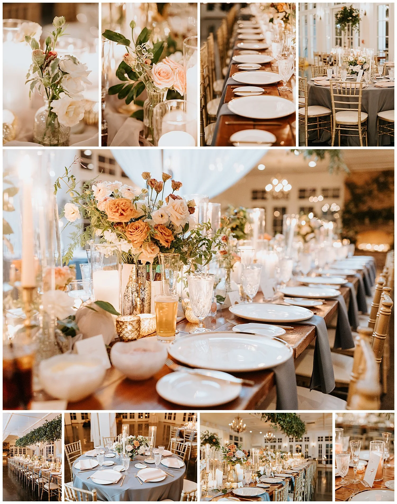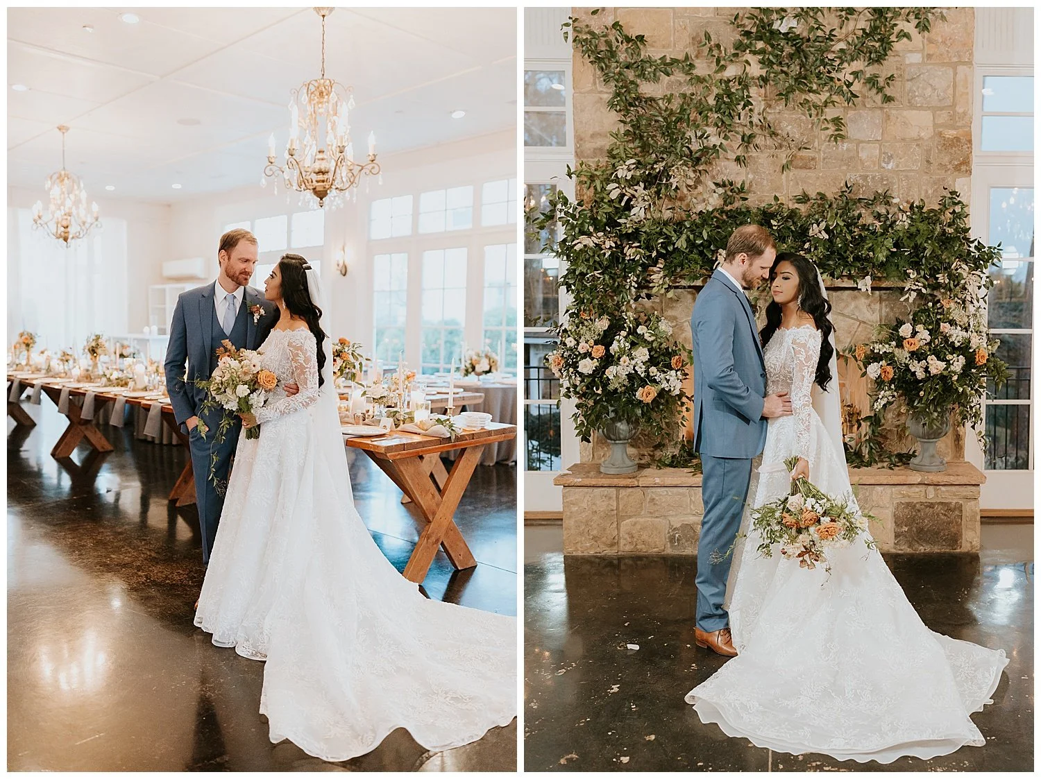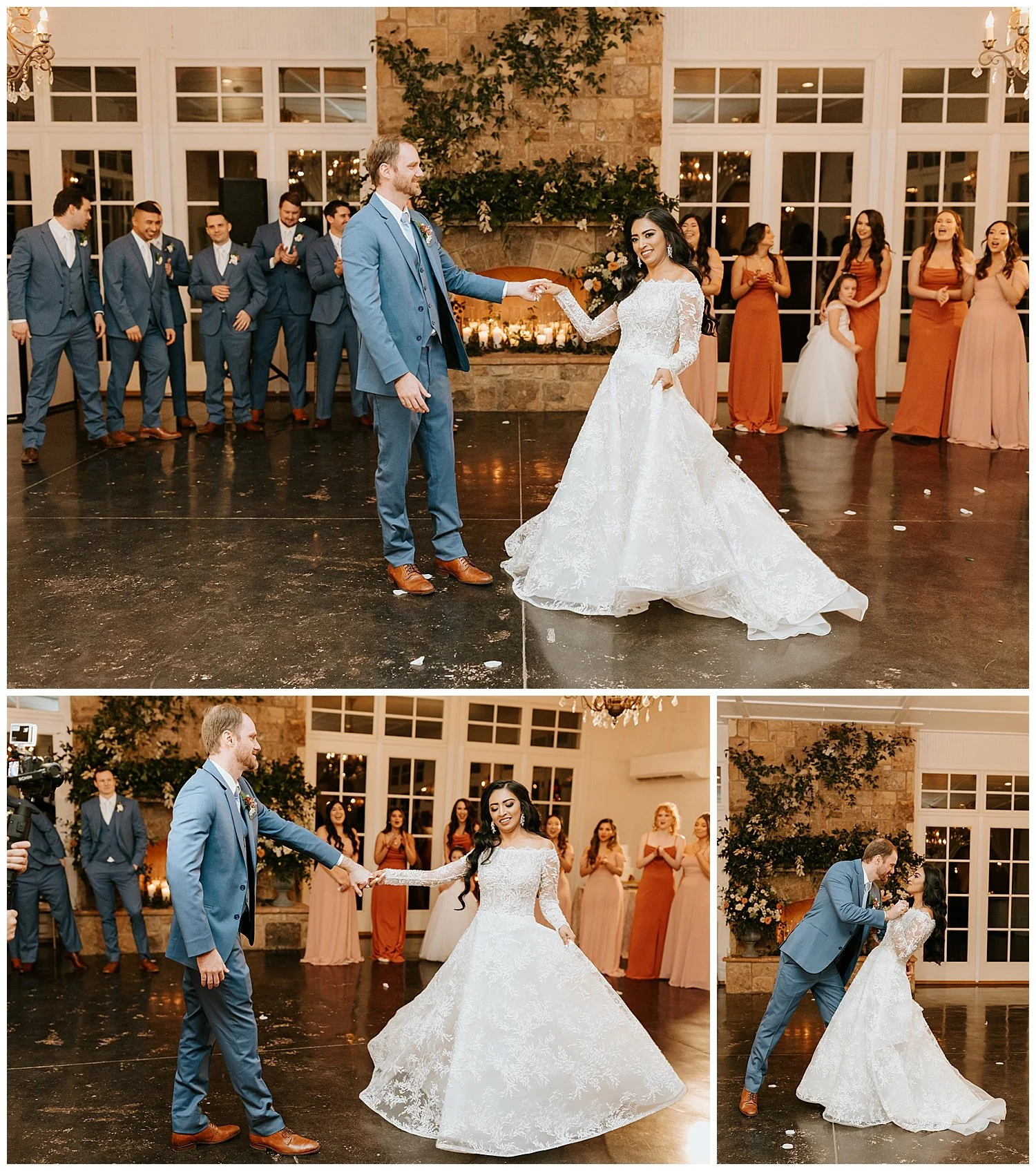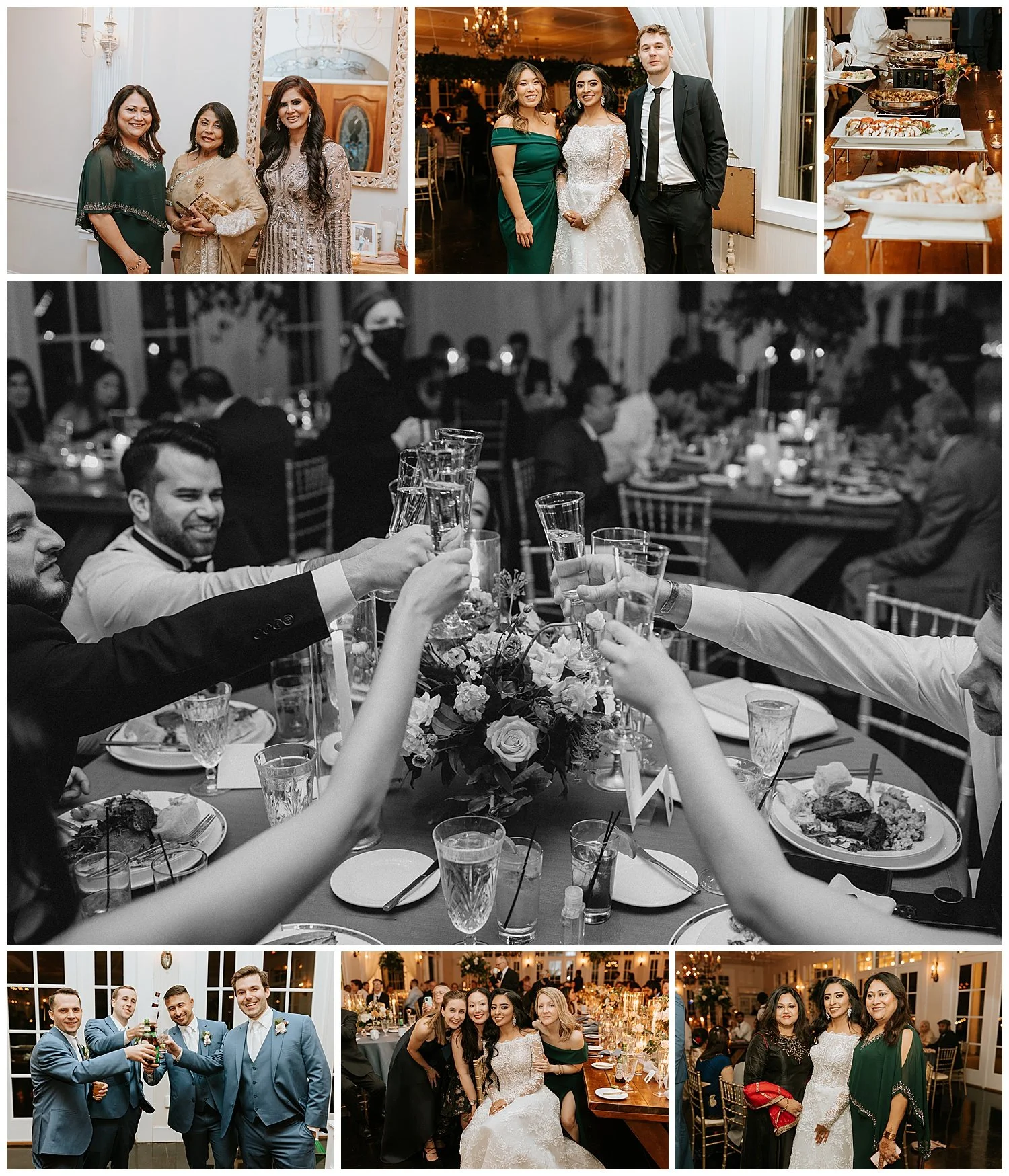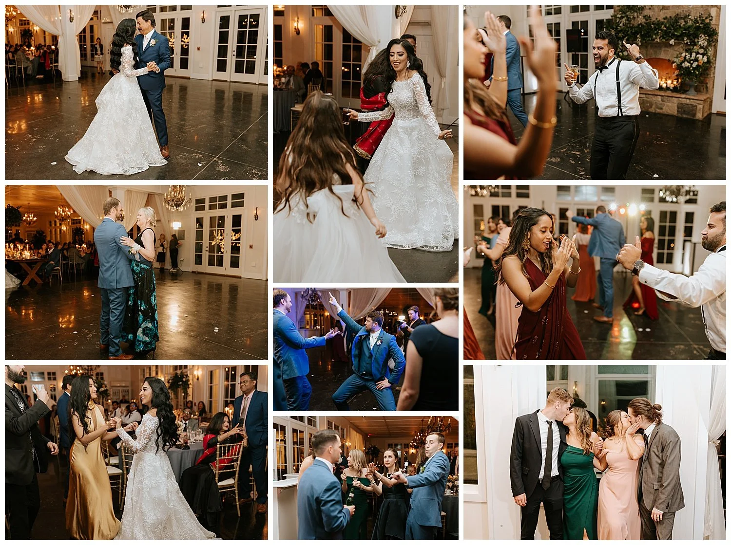 This wedding was recently featured on CARATS AND CAKE wedding blog and we are so proud that our work has once again gained the recognition by a high end wedding publication and been featured on their website. Sp proud to be posting this wedding on our blog as well. We had the pleasure as Atlanta wedding luxury photographers to capture this wedding that took place at Little River Farms in Milton, Georgia. Farida was a wonderful bride to work with because she really cared about the decor and the details and had the vision of what she wanted captured so it made it so much easier to get these final beautiful images from this wedding. Little River Farms is one of my favorite venues to photograph weddings, its spacious, its got so many option for portraits, offers several places for the ceremony and has a backup plan in case of inclement weather. Farida and Spencer decided to have their ceremony indoors since they got married in early March and the weather would be kinda chilly around that time of year in Georgia. Little River Farms offers this beautiful fireplace room as the backdrop for her ceremony, with pristine white ceilings and walls, and these beautiful chandeliers to adorn her photos. Stylish Stems Atlanta did a marvelous job at decorating the fireplace and the reception room to make the bride’s vision come alive. Paper Daisies Stationery created the gorgeous invitation suite that complimented the details with the soft blue, pink and grey invite set. Let’s talk about the bride’s dress which was designed by the talented Dany Tabet and purchased from White Magnolia Bridal in Atlanta. The wedding dress carried the classic theme with beautiful off the shoulder long sleeves and floral details that just complimented the bride so well. The bridesmaids wore Birdy Grey dresses in mismatched colors and styles in peachy-orange shades. This wedding was a blast and the wedding party sure had so much fun getting down on the dance floor. As luxury wedding photographers, we are always keeping an eye out on all corners of the room and we get right in the middle of everyone to capture the best photos of the guests dancing and letting loose. We make sure to capture those emotional and happy moments throughout the day. This is also why it’s important to have a second shooter, so that we can make sure to keep our eyes out for your guests as well as your family and bridal party.