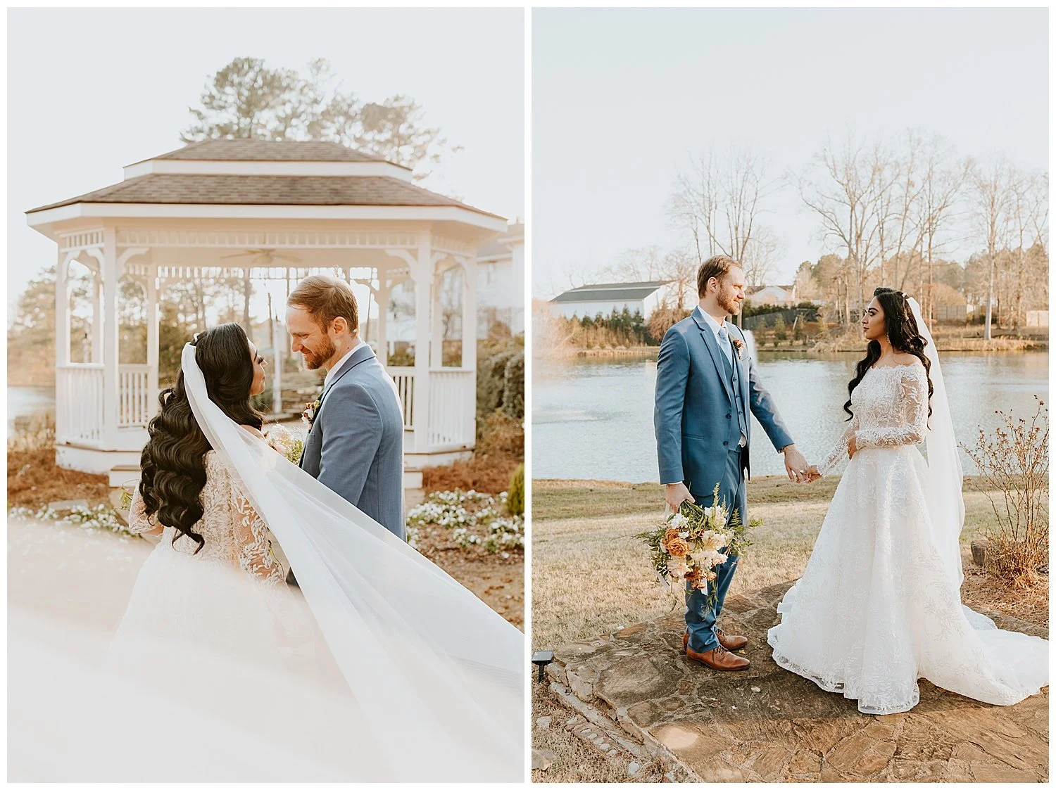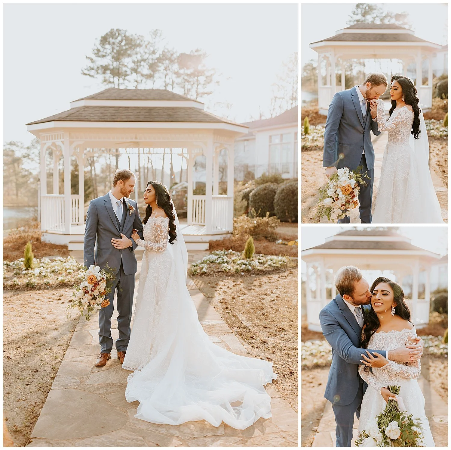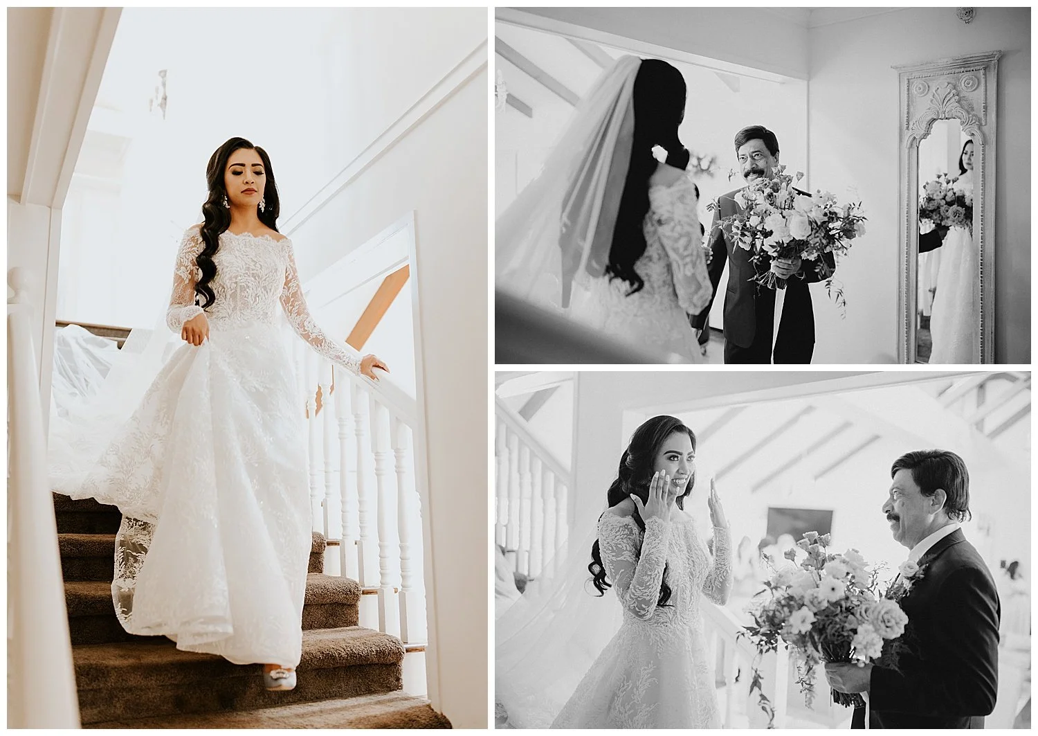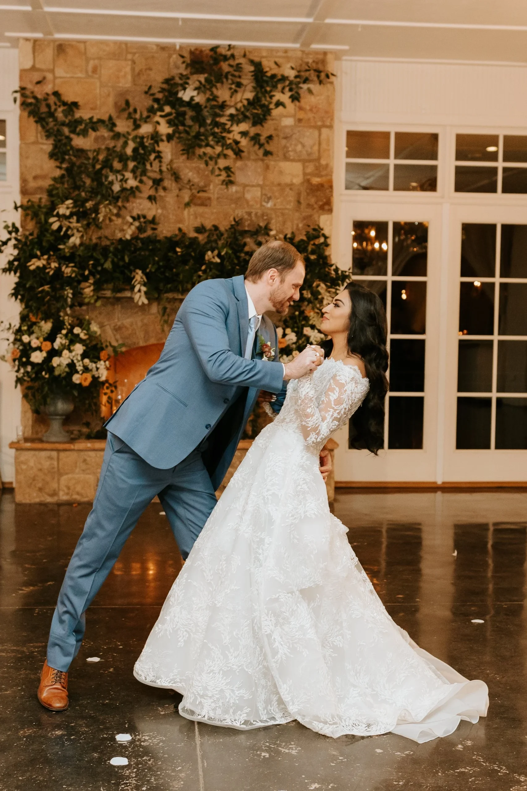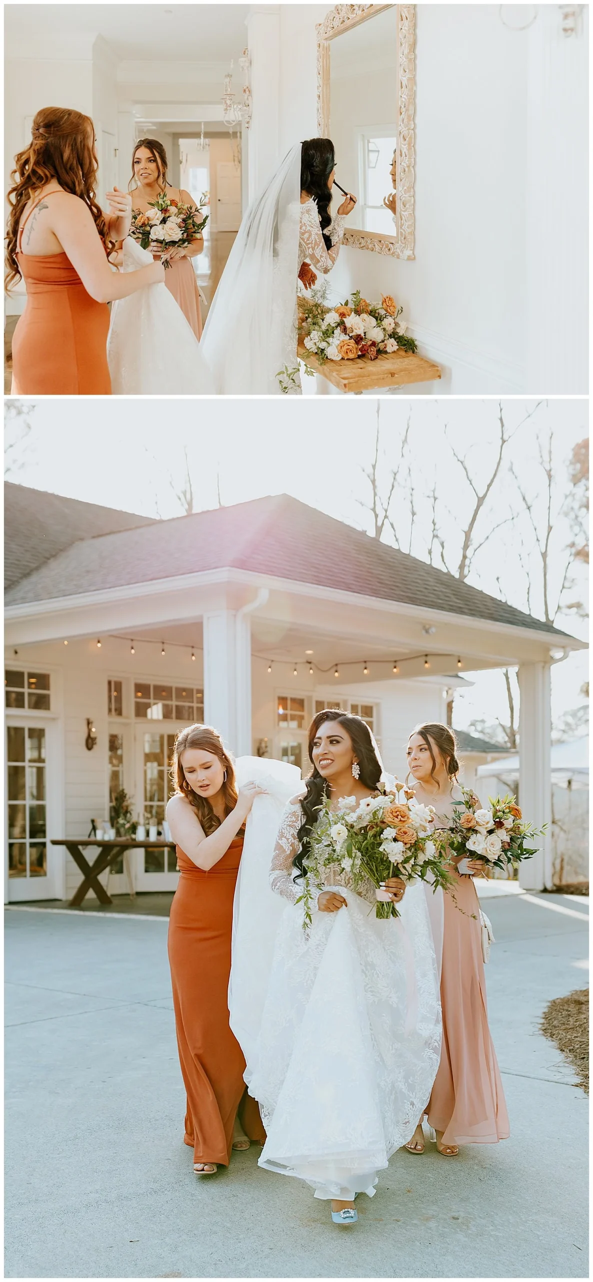 This wedding was recently featured on CARATS AND CAKE wedding blog and we are so proud that our work has once again gained the recognition by a high end wedding publication and been featured on their website. Sp proud to be posting this wedding on our blog as well. We had the pleasure as Atlanta wedding luxury photographers to capture this wedding that took place at Little River Farms in Milton, Georgia. Farida was a wonderful bride to work with because she really cared about the decor and the details and had the vision of what she wanted captured so it made it so much easier to get these final beautiful images from this wedding. Little River Farms is one of my favorite venues to photograph weddings, its spacious, its got so many option for portraits, offers several places for the ceremony and has a backup plan in case of inclement weather. Farida and Spencer decided to have their ceremony indoors since they got married in early March and the weather would be kinda chilly around that time of year in Georgia. Little River Farms offers this beautiful fireplace room as the backdrop for her ceremony, with pristine white ceilings and walls, and these beautiful chandeliers to adorn her photos. Stylish Stems Atlanta did a marvelous job at decorating the fireplace and the reception room to make the bride’s vision come alive. Paper Daisies Stationery created the gorgeous invitation suite that complimented the details with the soft blue, pink and grey invite set. Let’s talk about the bride’s dress which was designed by the talented Dany Tabet and purchased from White Magnolia Bridal in Atlanta. The wedding dress carried the classic theme with beautiful off the shoulder long sleeves and floral details that just complimented the bride so well. The bridesmaids wore Birdy Grey dresses in mismatched colors and styles in peachy-orange shades. This wedding was a blast and the wedding party sure had so much fun getting down on the dance floor. As luxury wedding photographers, we are always keeping an eye out on all corners of the room and we get right in the middle of everyone to capture the best photos of the guests dancing and letting loose. We make sure to capture those emotional and happy moments throughout the day. This is also why it’s important to have a second shooter, so that we can make sure to keep our eyes out for your guests as well as your family and bridal party.