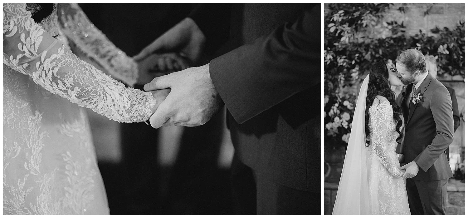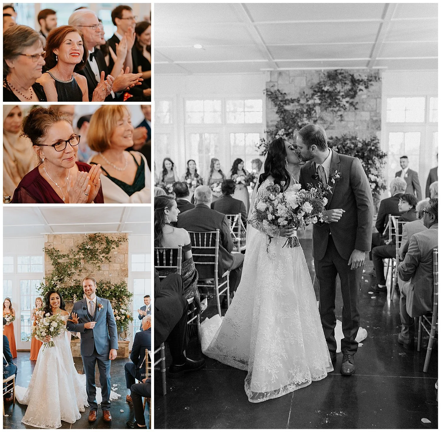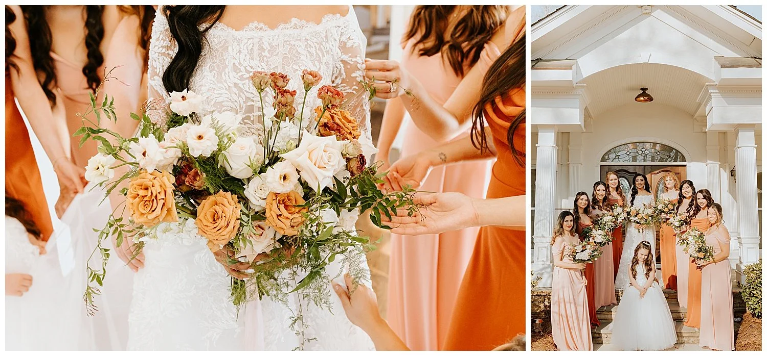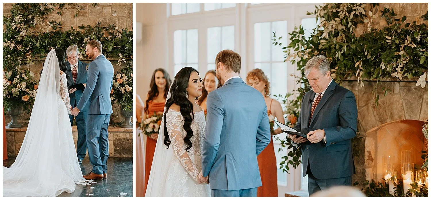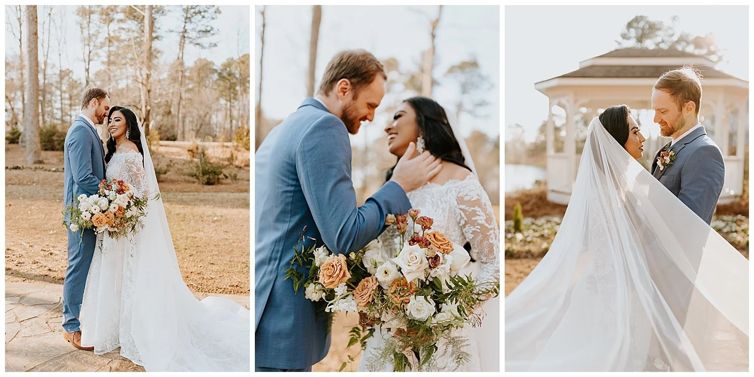 This wedding was recently featured on CARATS AND CAKE wedding blog and we are so proud that our work has once again gained the recognition by a high end wedding publication and been featured on their website. Sp proud to be posting this wedding on our blog as well. We had the pleasure as Atlanta wedding luxury photographers to capture this wedding that took place at Little River Farms in Milton, Georgia. Farida was a wonderful bride to work with because she really cared about the decor and the details and had the vision of what she wanted captured so it made it so much easier to get these final beautiful images from this wedding. Little River Farms is one of my favorite venues to photograph weddings, its spacious, its got so many option for portraits, offers several places for the ceremony and has a backup plan in case of inclement weather. Farida and Spencer decided to have their ceremony indoors since they got married in early March and the weather would be kinda chilly around that time of year in Georgia. Little River Farms offers this beautiful fireplace room as the backdrop for her ceremony, with pristine white ceilings and walls, and these beautiful chandeliers to adorn her photos. Stylish Stems Atlanta did a marvelous job at decorating the fireplace and the reception room to make the bride’s vision come alive. Paper Daisies Stationery created the gorgeous invitation suite that complimented the details with the soft blue, pink and grey invite set. Let’s talk about the bride’s dress which was designed by the talented Dany Tabet and purchased from White Magnolia Bridal in Atlanta. The wedding dress carried the classic theme with beautiful off the shoulder long sleeves and floral details that just complimented the bride so well. The bridesmaids wore Birdy Grey dresses in mismatched colors and styles in peachy-orange shades. This wedding was a blast and the wedding party sure had so much fun getting down on the dance floor. As luxury wedding photographers, we are always keeping an eye out on all corners of the room and we get right in the middle of everyone to capture the best photos of the guests dancing and letting loose. We make sure to capture those emotional and happy moments throughout the day. This is also why it’s important to have a second shooter, so that we can make sure to keep our eyes out for your guests as well as your family and bridal party.