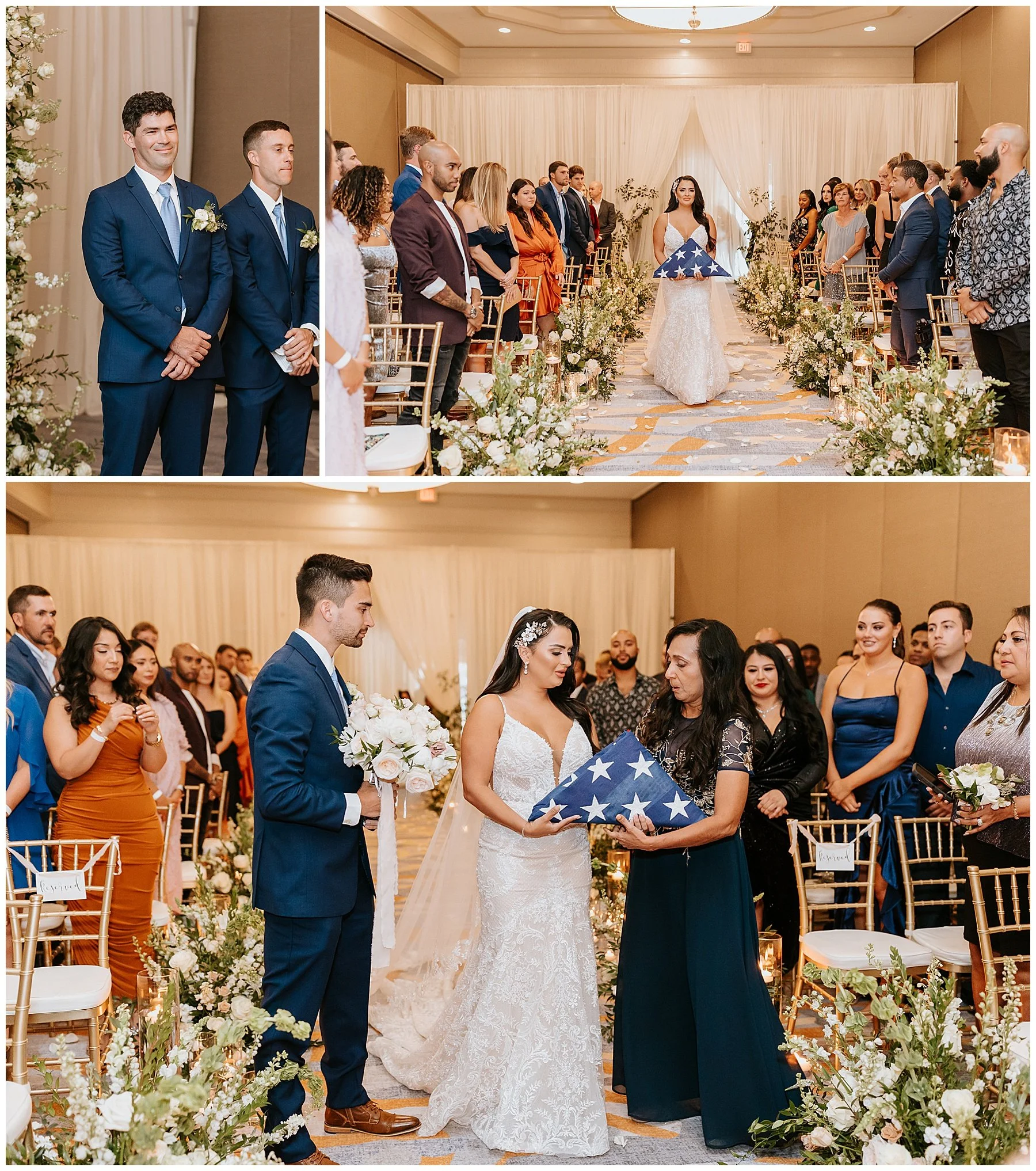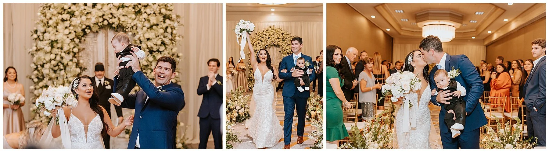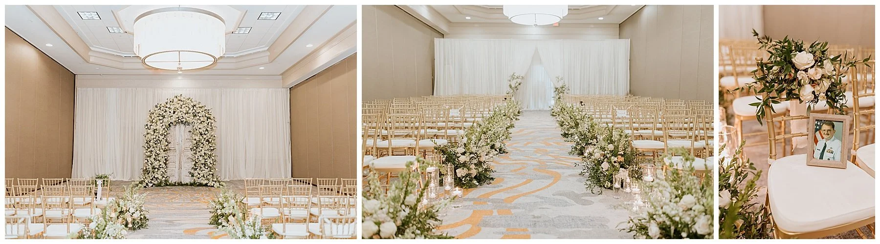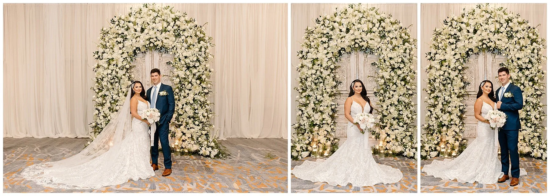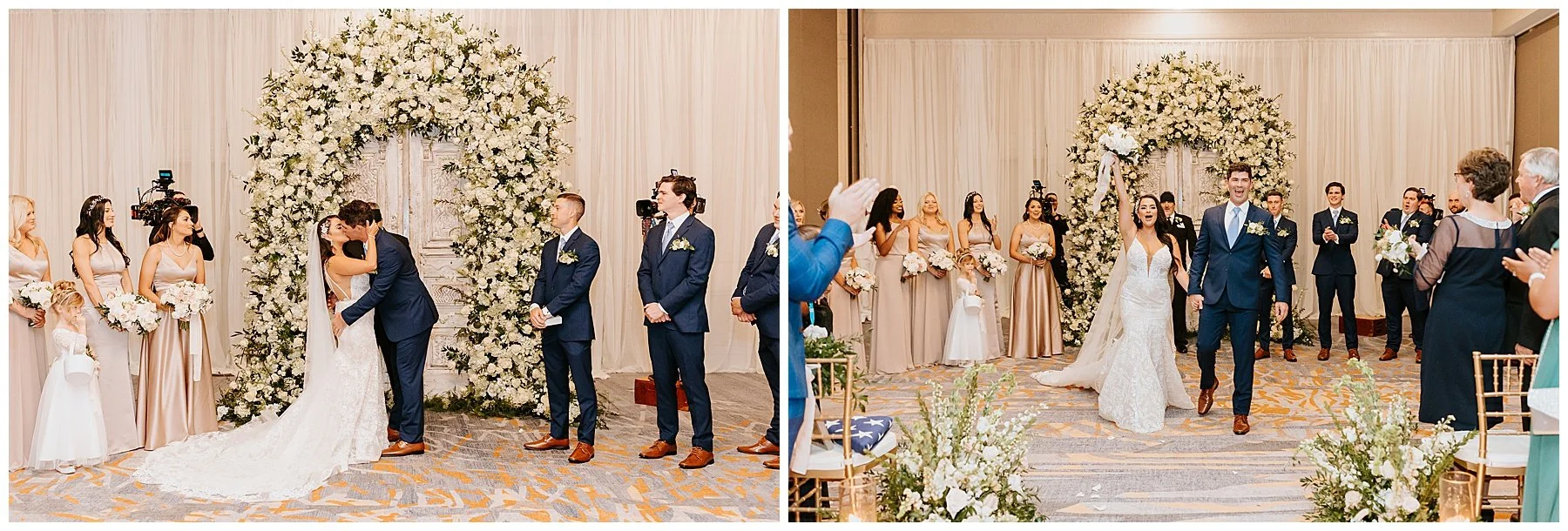 Nilsa chose us a couple of month’s before the wedding date to be her photographers and we were ecstactic. We worked closely with Miss Milly’s to create the best wedding day photo timeline for the bridal party and the couple. As wedding photographer’s we always want to be in close contact with the planner/coordinator in order to be in the know of all the events that need to be captured on the wedding day, and give our input on better location, time and lighting situations in order to achieve the best photographic results for the couple and all the vendors involved. Once the wedding day came around Miss Milly’s and the rest of their team worked tirelessly to create the beautiful wedding decor and floral arrangements for Nilsa’s wedding day! They initiated with Nilsa’s vision of transforming the ballroom into an ethereal garden and they achieved this through a draped aisle entrance, aisle floor gardens, and this arched floral arbor inspired by champagne! Nilsa chose one of our roommates on MTV’s Floribama Shore Codi Butts, to be her ‘beer guy’ instead of having a traditional ‘flower girl’. She also paid tribute to her father by carrying his flag down the aisle and saving him a seat on the front row. They said their ‘i do’s’ and on to the party which was LIT! Nilsa and Gus had DJ Yemi getting everybody to the dance floor and celebrating together! The couple’s send off was a sparkler’s send off on to a carriage and exited like royalty into their best life together!